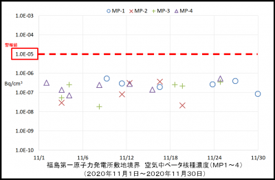 なお、東京電力ホールディングス株式会社福島第一原子力発電所では警報値を0.00001ベクレル/立方センチメートルとして監視しています(警報値の根拠:周辺監視区域外の告示濃度(3ヶ月間平均濃度(セシウム134代表))の2分の1の値)。