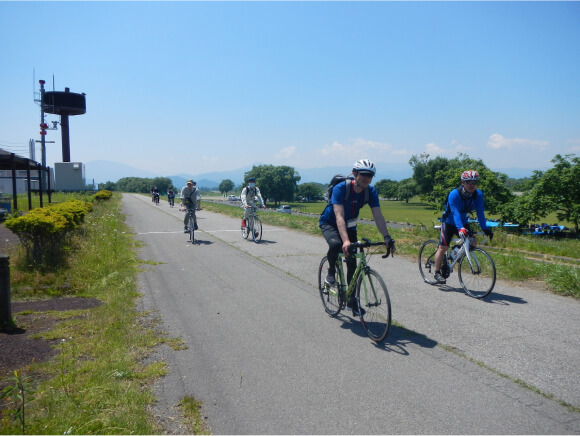 川沿いにあるため起伏が少なく、トイレが併設された休憩所が4カ所、道の駅が2カ所あり、初心者からファミリー層まで利用しやすいサイクリングロードです。四季折々の風景と、観光名所や旧跡が数多く点在しているのも魅力。始点と終点にはそれぞれの温泉の足湯があり、疲れた体を休めてくれます。