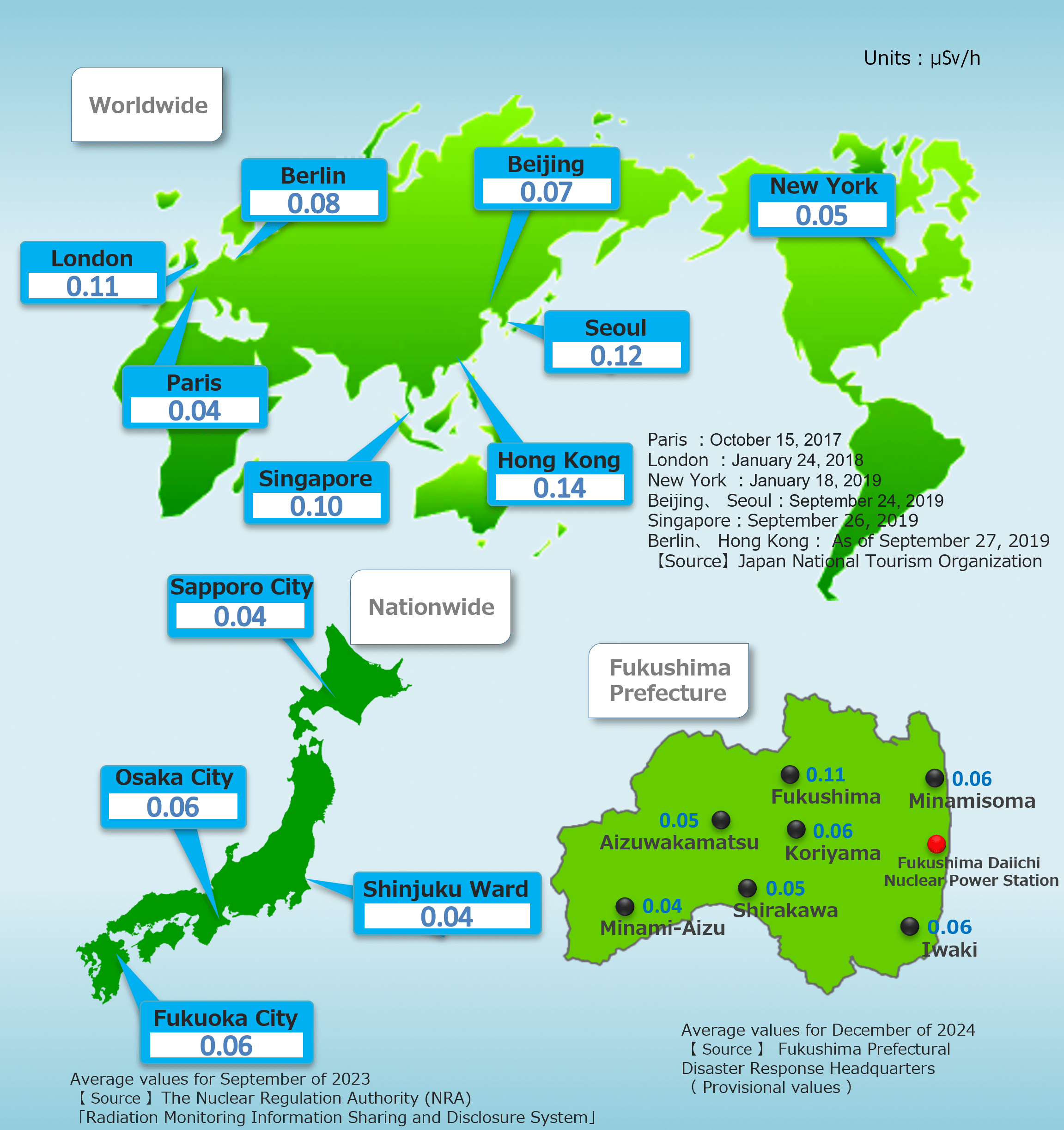- Compared to the radiation levels immediately after the earthquake, the current levels have significantly decreased due to natural decay and decontamination efforts. They have been reduced to a level comparable to the world's major cities and most of the cities in the country.