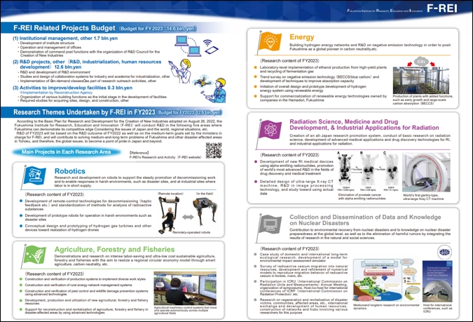 The Fukushima Institute for Research, Education and Innovation(F-REI) is a legal entity that will be established by the Government of Japan as a world-class, core centre for creative reconstruction to realize the revitalization of Fukushima and other parts of the Tohoku region as well as contributing to driving Japan's scientific and technological capabilities and industrial competitiveness(established in Apr. 2023). This institute will promote cooperation between industry hubs created by the initiatives of the Fukushima Innovation Coast Framework and embody and develop the concept further.