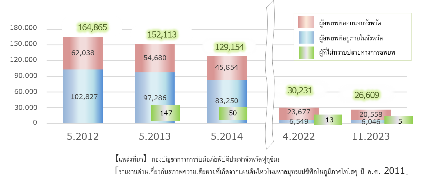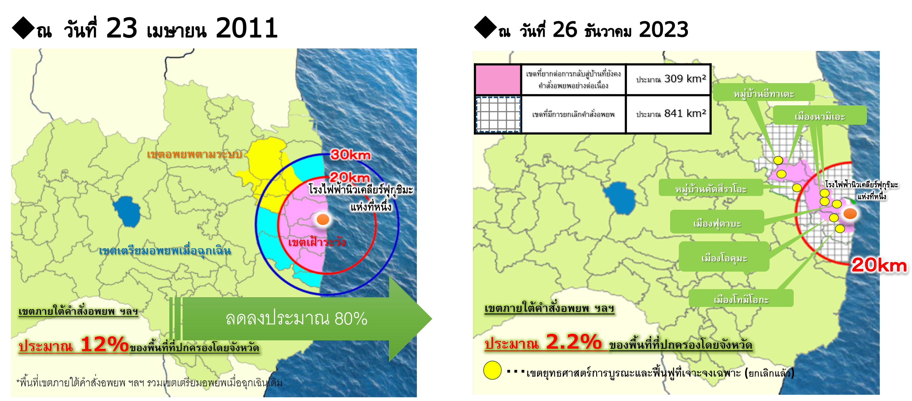ตั้งแต่เดือนมิถุนายน ปีเรวะที่ 4 (ค.ศ. 2022) จนถึงเดือนพฤศจิกายน ปีเรวะที่ 5 (ค.ศ. 2023) มีการยกเลิกคำสั่งอพยพทั้งหมดของเมืองและหมู่บ้าน 6 แห่ง (เมืองโทมิโอกะ เมืองโอคุมะ เมืองฟุตาบะ เมืองนามิเอะ หมู่บ้านคัตสึราโอะ หมู่บ้านอีทาเตะ) ที่ถูกกำหนดให้เป็นเขตยุทธศาสตร์การบูรณะและฟื้นฟูที่เจาะจงเฉพาะ