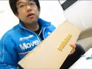 毎週木曜日に行われるミーティングにおいて、豆を固定するための方法を検討。写真は、みんな未来センター高橋氏が、両面テープを使用して固定状況を確認している様子。