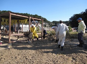 福島県内の7か所に設置した『心の駅』は木造のため定期的にメンテナンスをする必要があります。地域の方々との共同作業により、7か所全てのペンキ塗りなど修理、修繕を行いました。地域の区長さんから震災後初めて行われた防災訓練に呼んでいただき、参加しました。直前の台風で浜の「心の駅」が被害を受け傾いたり、イスが壊れたりしておりましたが、地域のみなさまの協力によりきれいに復活しました。