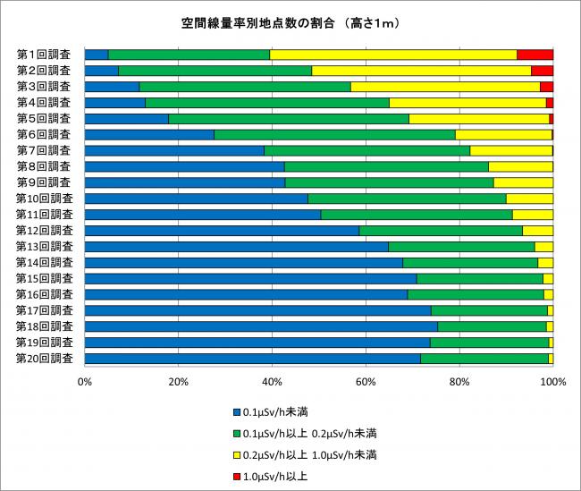 平成23年度に実施した第1回調査では、0.2μSv/h未満の地点数の割合は39.5%でしたが、今回の調査では99.0%となっております。