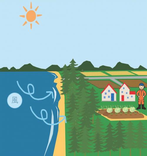 森林は潮風や飛砂、津波、高潮を弱め、住宅や田畑への塩害から守る機能を持っています。