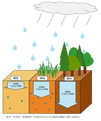 森林の下層植生や落枝落葉が降水による地表の浸食を抑制するとともに、立木が地中に根を張り巡らせ、土壌中の岩石や砂と絡み、土砂の流出や崩落を抑制する機能を持っています。