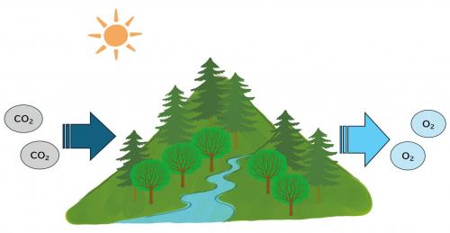 樹木や植物は、光合成により空気中の二酸化炭素を吸収し、酸素を作り出しています。吸収した二酸化炭素を炭素として幹や枝に貯め込み成長します。大きく成長した木は、将来伐って木材として利用し、あと地に新たな苗木を植えて育つ中で、再び二酸化炭素を吸収します。
