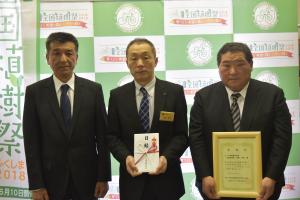 2 出席者 (1)アース建設株式会社 代表取締役 渡部 明雄 様 (2)アース建設株式会社 専務取締役 渡部 浩司 様 (3)第69回全国植樹祭福島県実行委員会 幹事長代理 佐藤 清丸 〔福島県農林水産部技監〕 左から、渡部専務取締役、佐藤幹事長代理、渡部代表取締役