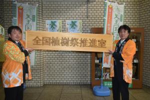 第69回全国植樹祭開催まで残すところ約1年となりました。 新年度を迎えるに当たり、佐竹農林水産部長、鈴木室長が、執務室入り口に木製看板を設置しました。また、全国植樹祭推進室の職員に対し、植樹祭の成功に向け取り組んでいくよう、部長から訓示がありました。