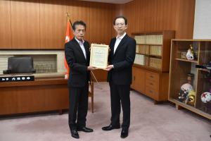 日本労働組合総連合会福島県連合会様から、第69回全国植樹祭のための協賛をいただき、実行委員会会長(内堀知事)から感謝状を贈呈しました。