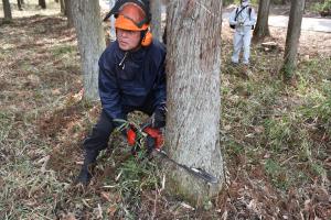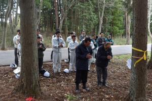 4月13日(木)に、福島県林業研究センター「あさかの森」において、福島県での前回大会である第21回全国植樹祭で、昭和天皇皇后両陛下にお手播き賜ったスギの伐採式を行いました。