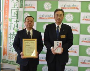 遠野興産株式会社様から、第69回全国植樹祭のための協賛をいただき、感謝状を贈呈しました。