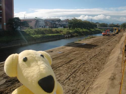 この河川改修では周辺の安心安全を確保するため、河道を広げる工事が進められています。