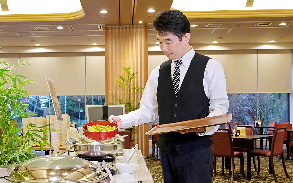 ビュッフェ会場のご案内など料飲サービスをしています。