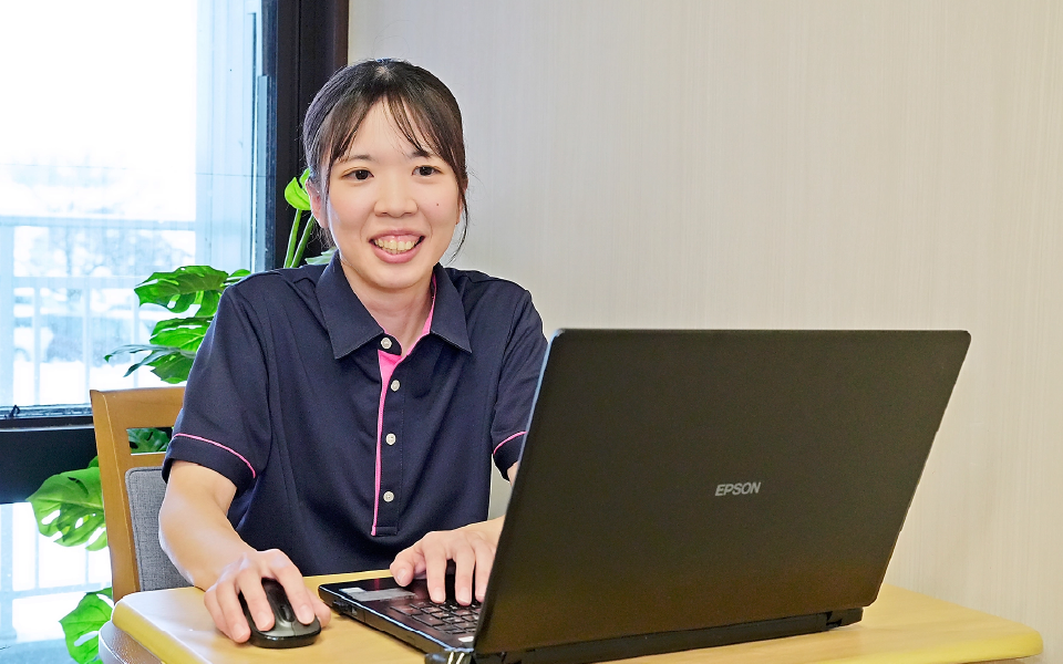 介護職は、利用者の方と接する時間が長く、ありがとうと笑顔を見せていただいた時、この仕事をしていて良かったと思います。自分が笑顔でいれば、利用者の方も笑顔になれると思って頑張っています。