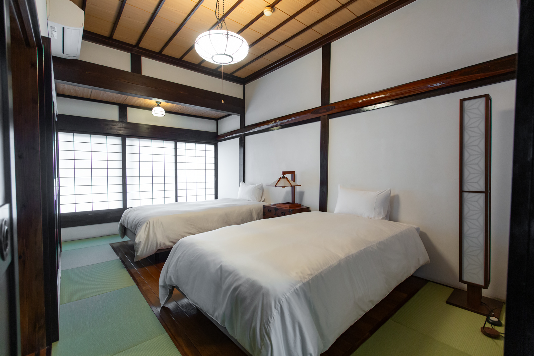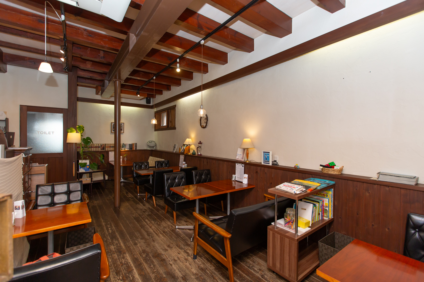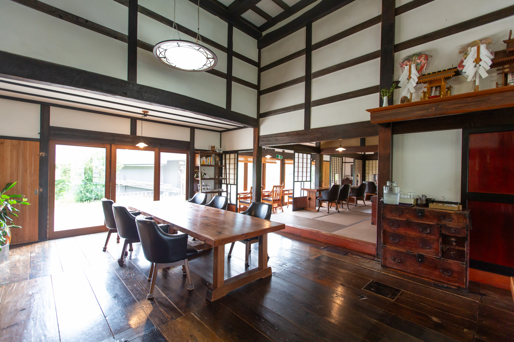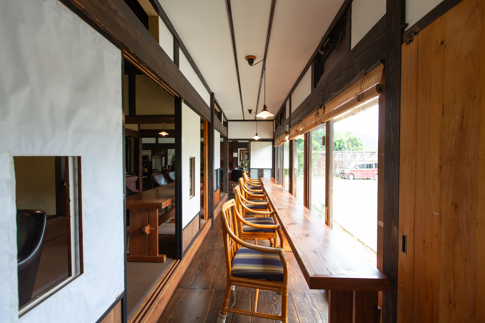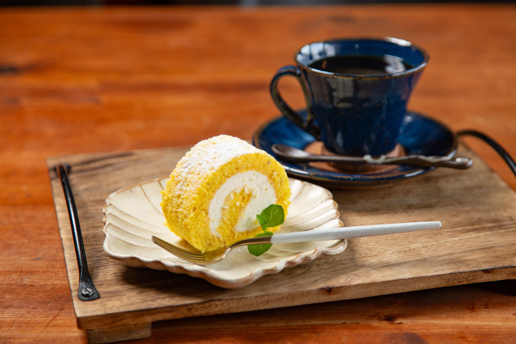 在古民宅咖啡館「分家 玉屋」享用甜點。用米粉做的捲心蛋糕微甜Q彈。店內十分寬敞,舒適宜人。讓人想品嘗各種甜點!