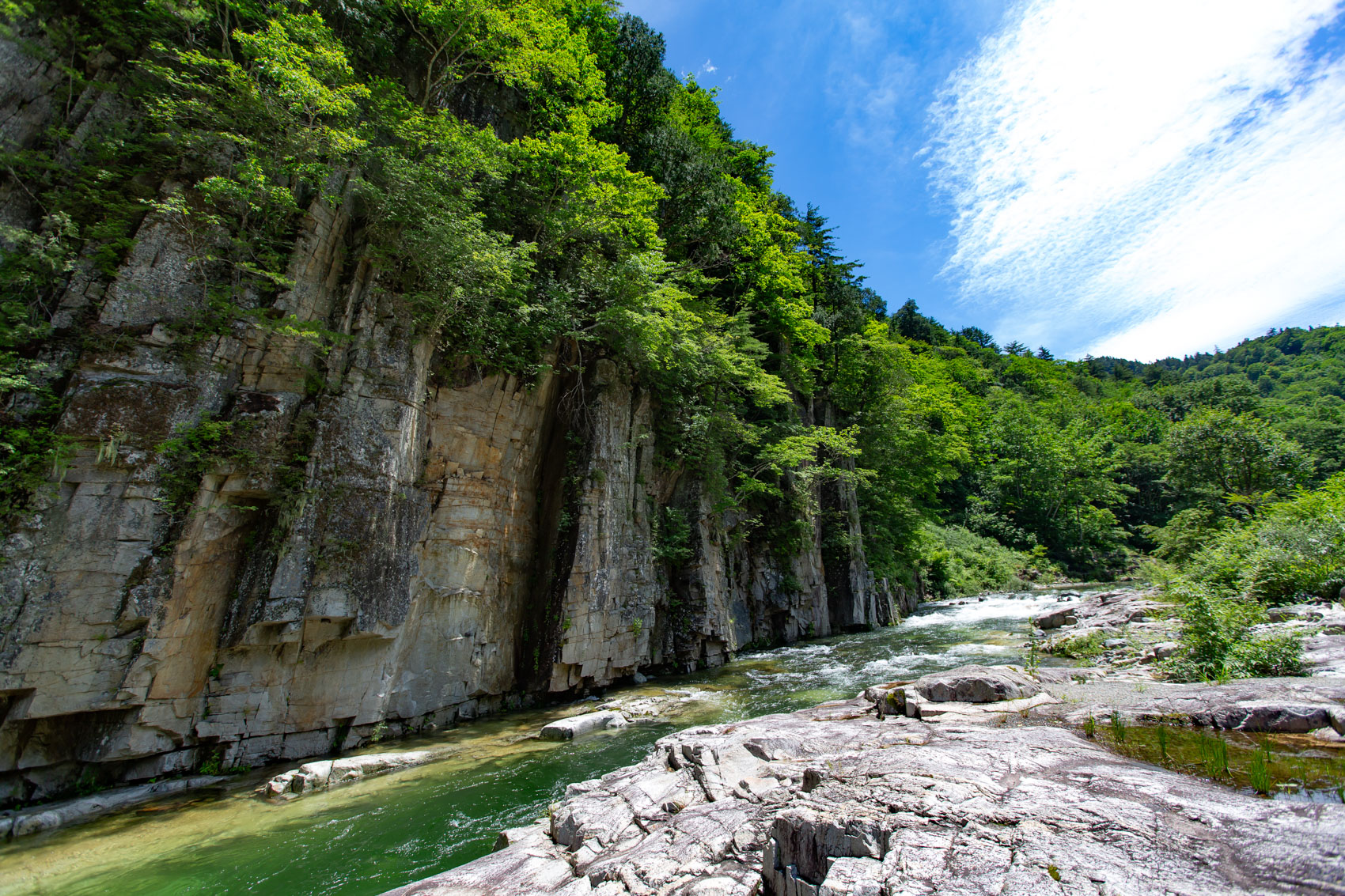 前往檜枝岐村途中出現的屏風岩。建議此處一定要前往下方欣賞!保證會深為優美通透的伊南和聳立的奇岩怪石所震撼!