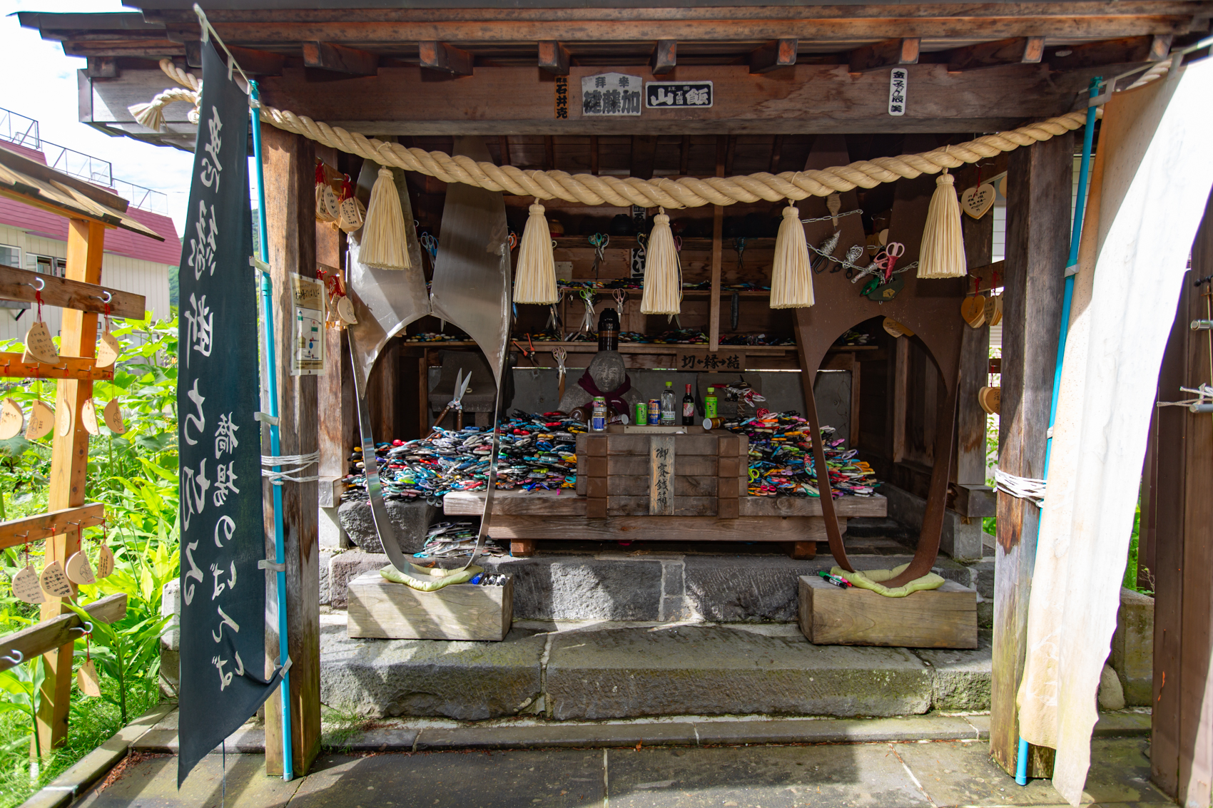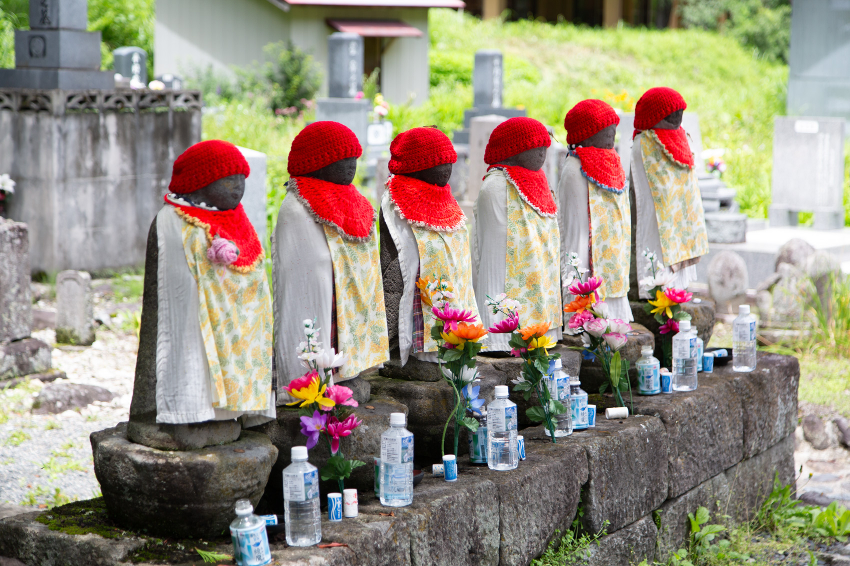 抵達福島的祕境--檜枝岐村!!巨大的門戶令人印象深刻。在前往旅宿的路上,靜靜排列的六地藏。春天可欣賞與櫻花樹交織的美景。