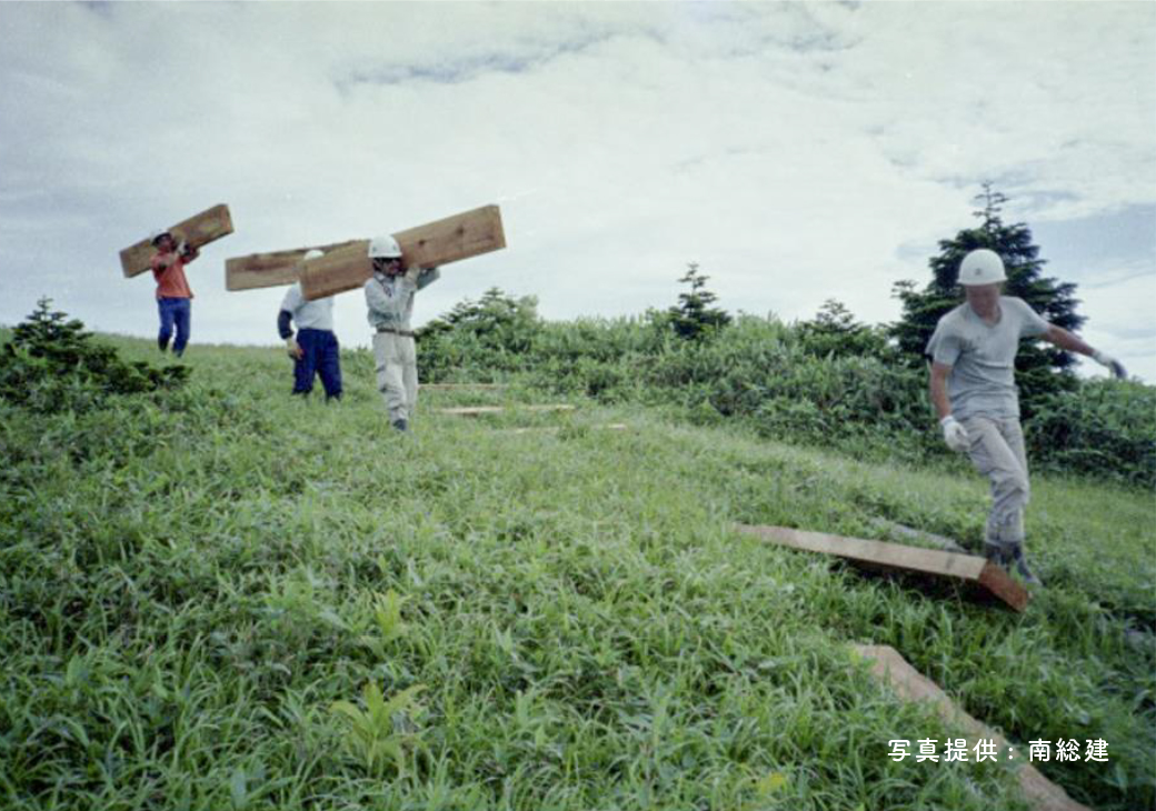 木道設置で大変なのは維持管理です。木道の耐用年数は環境にもよりますが約10年。ヘリコプターで資材を運搬する以外はほとんど人力です。現在の相場では設置には片側1mで10万円以上の費用がかかります。また少子高齢化のため作業員の確保が年々難しくなっているようです。