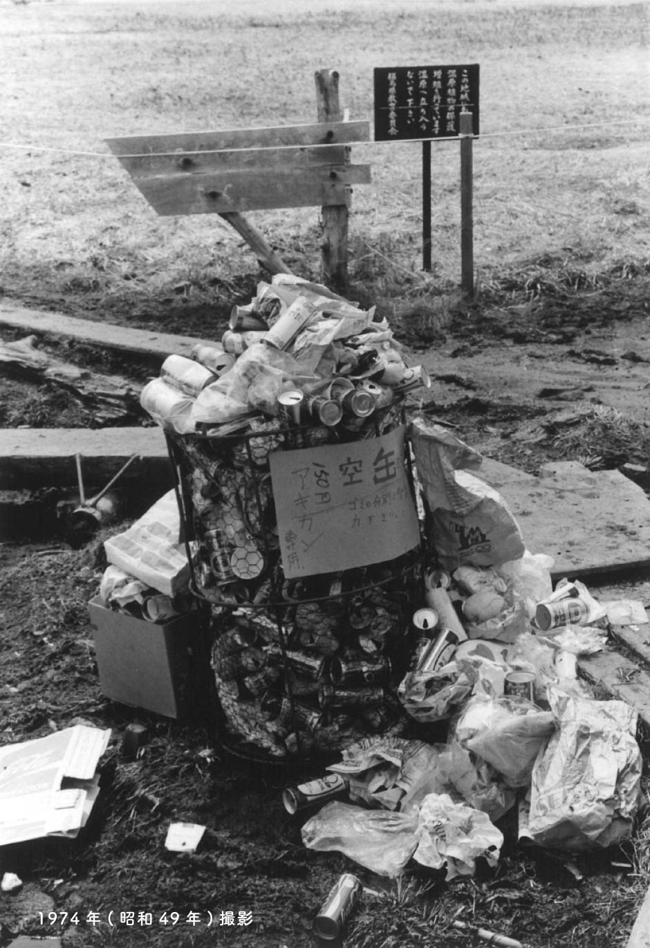 多くの入山者が訪れるようになると、尾瀬ではごみ問題が大きな課題となりました。そこで、昭和47年に全国の国立公園に先駆けて「ごみ持ち帰り運動」が始まりました。「ごみ箱があるからごみを捨てる」、それならば「ごみ箱をなくせばごみを捨てなくなる」という発想の転換で、尾瀬では1400を超えるごみ箱の撤去を行いました。この運動は全国の国立公園へ広がりを見せます。現在、尾瀬を含めた多くの国立公園や観光地でごみ持ち帰り運動が行われています。
