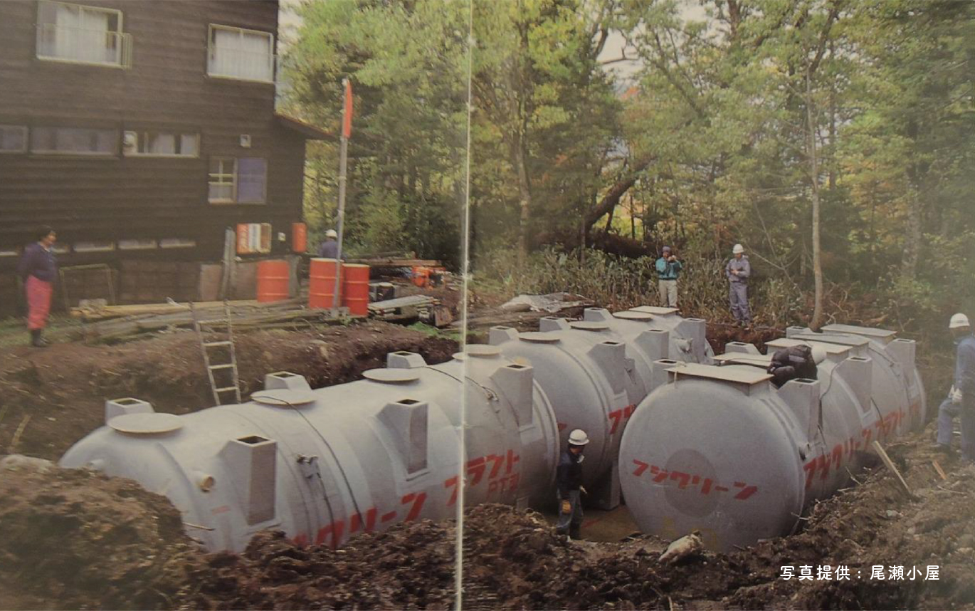 山小屋や公衆トイレから排水がそのまま流れ出てしまうと、湿原や川が富栄養化して自然のバランスが壊れてしまいます。そのため、尾瀬では汚れた水が湿原に入らないように浄化槽を設置。処理の最後に残った汚泥は熱で乾燥させ、ヘリで尾瀬の外に運ばれます。