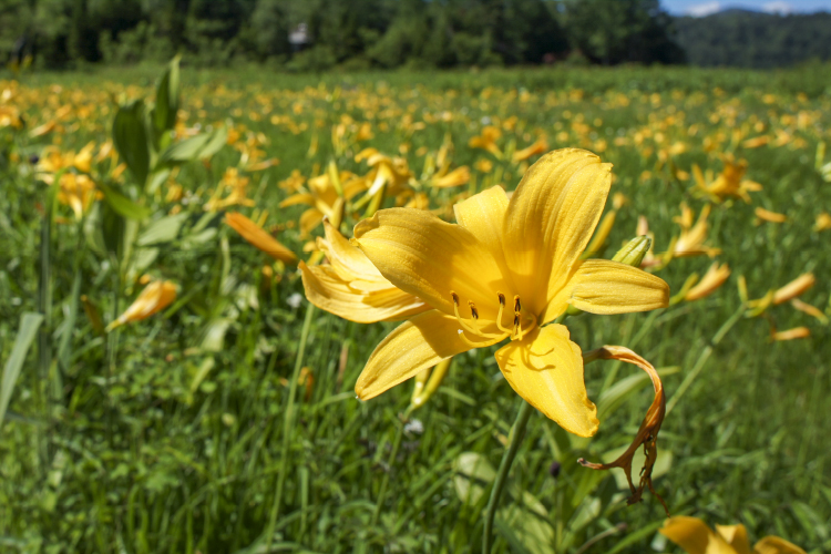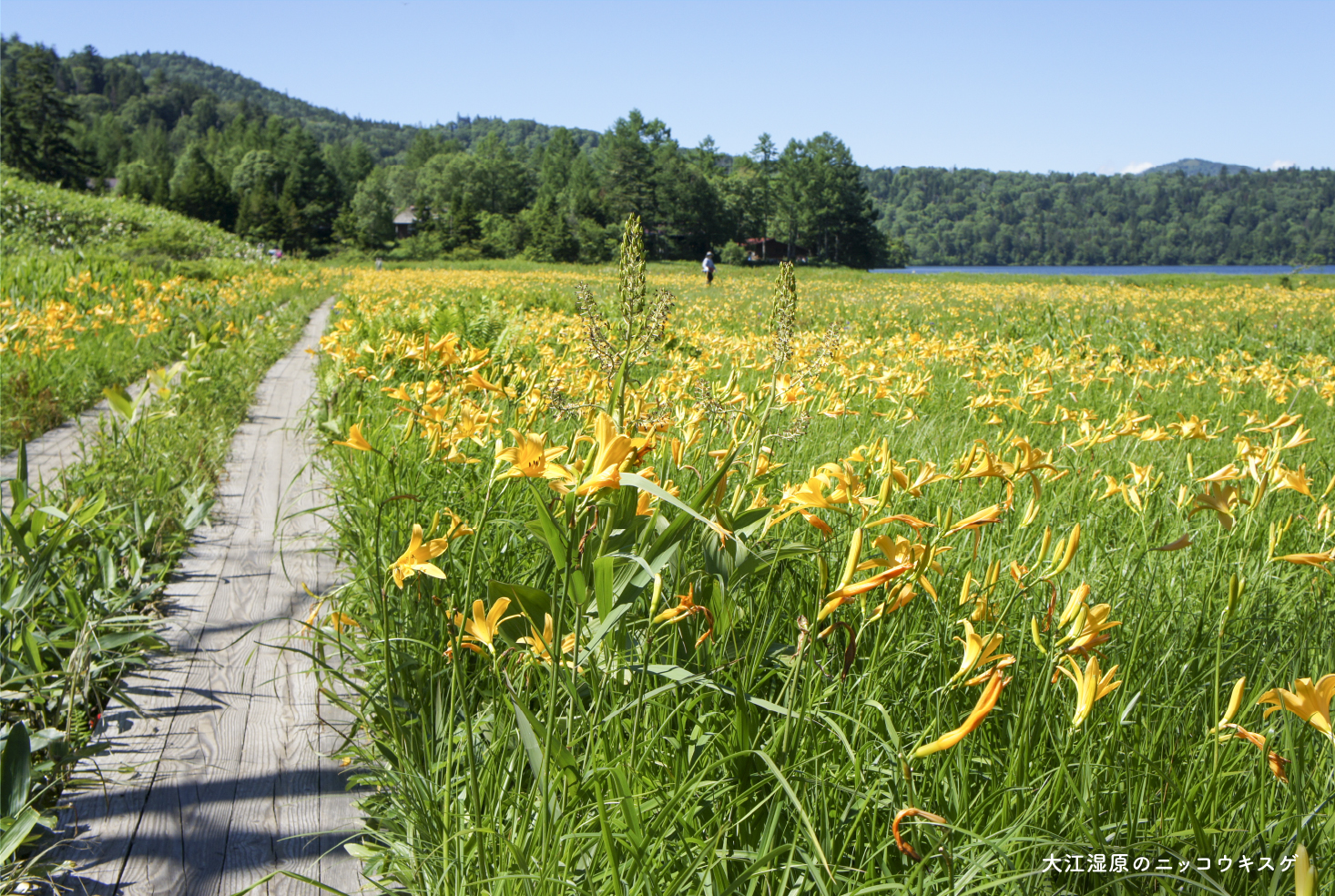 湿原を黄色に染めるニッコウキスゲ。例年7月20日頃に見頃を迎えます。福島県側の登山口「沼山峠」から小一時間の場所にある大江湿原の三本カラマツ周辺は、花の密度が濃く一見の価値あり。1株に5つほどつぼみをつけ順番に開花していきますが、花は1日でしぼんでしまいます。可憐で見頃が短い短命な花です。ニッコウキスゲは鹿の食害により尾瀬では減少傾向です。