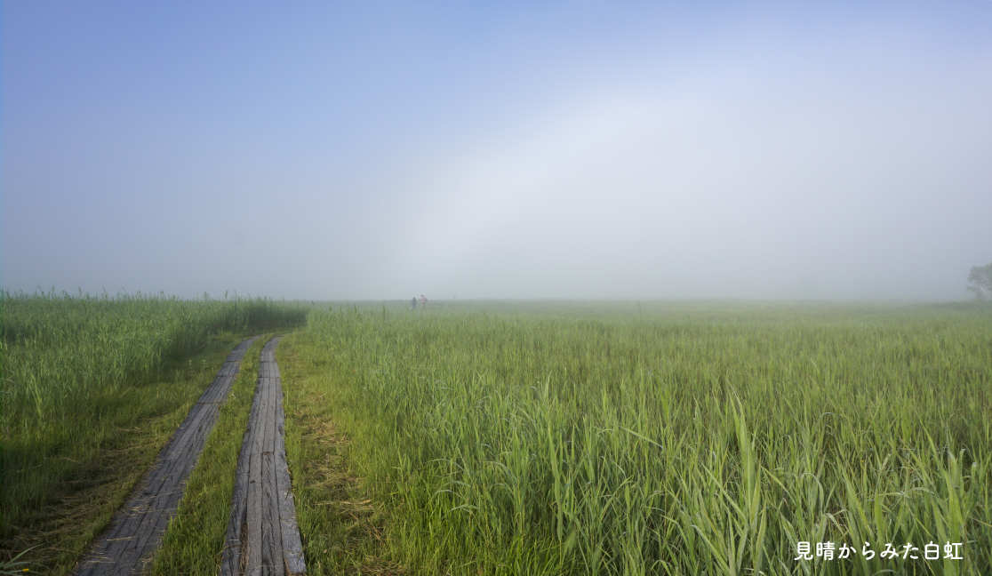 夏の尾瀬ではしばしば朝もやが現れます。白虹は朝もやの中、特定の気象条件がそろったときに現れるめずらしい自然現象です。湿原に半円の白虹が現れ幻想的な光景を作り出します。