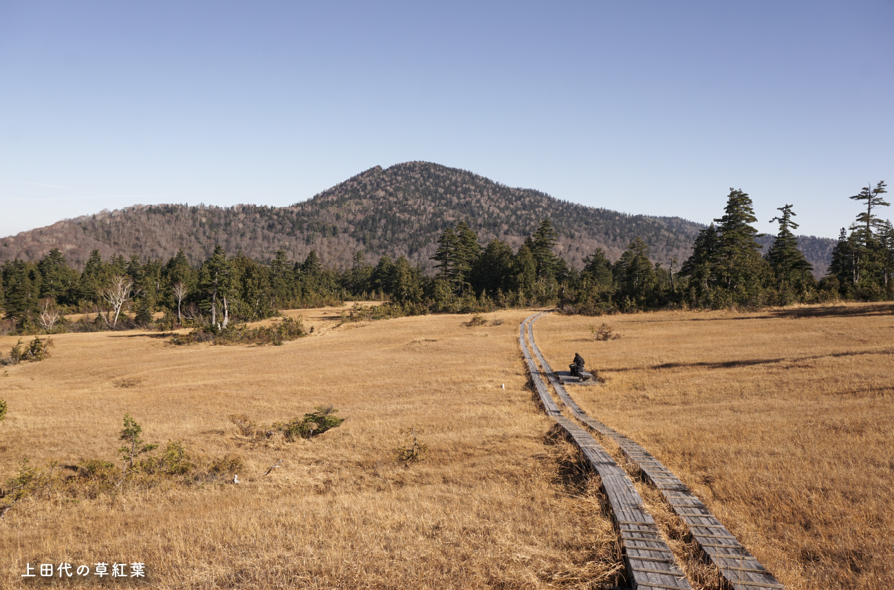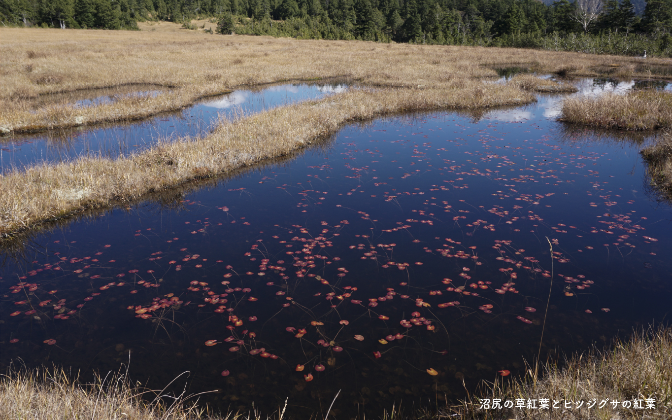 草紅葉は9月中旬に始まり10月末まで長く楽しむことができるのも嬉しいところ。段々と色が抜けていく草紅葉も大変美しく、池塘に浮かぶヒツジグサの赤との対比も素晴らしいです。