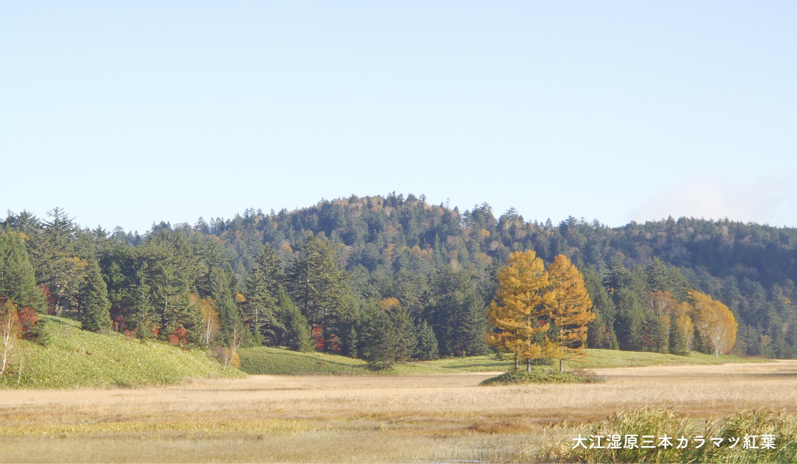 10月下旬に見頃となる大江湿原にある三本カラマツはオススメの撮影ポイントです。