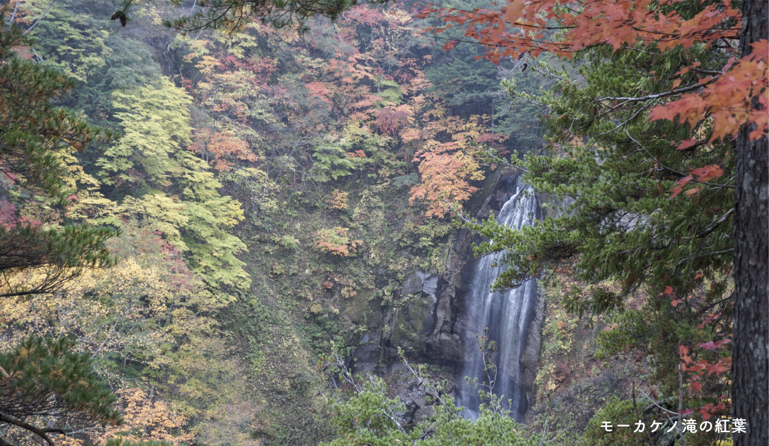 御池古道の中間にあるモーカケノ滝は、駐車場から徒歩5分で行ける立ち寄りスポットです。紅葉の時期は色づいた木々と滝の共演がとても見事ですので、御池からの帰りにプラッと寄ってみてください。カエデ類の紅色が多く華やかな紅葉が楽しめます。もちろん御池古道を歩いて行くこともできます。