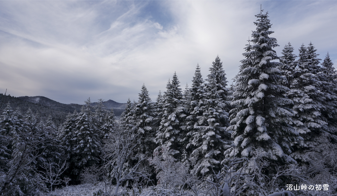 標高の高い燧ヶ岳では9月下旬に、尾瀬沼や大江湿原でも10月後半には初雪となります。シーズン始めの雪は湿り気が多く、木々に着雪しやすく白く雪化粧した針葉樹は大変綺麗です。積雪が多くなるとシャトルバスが運休になる場合があるので注意しましょう。