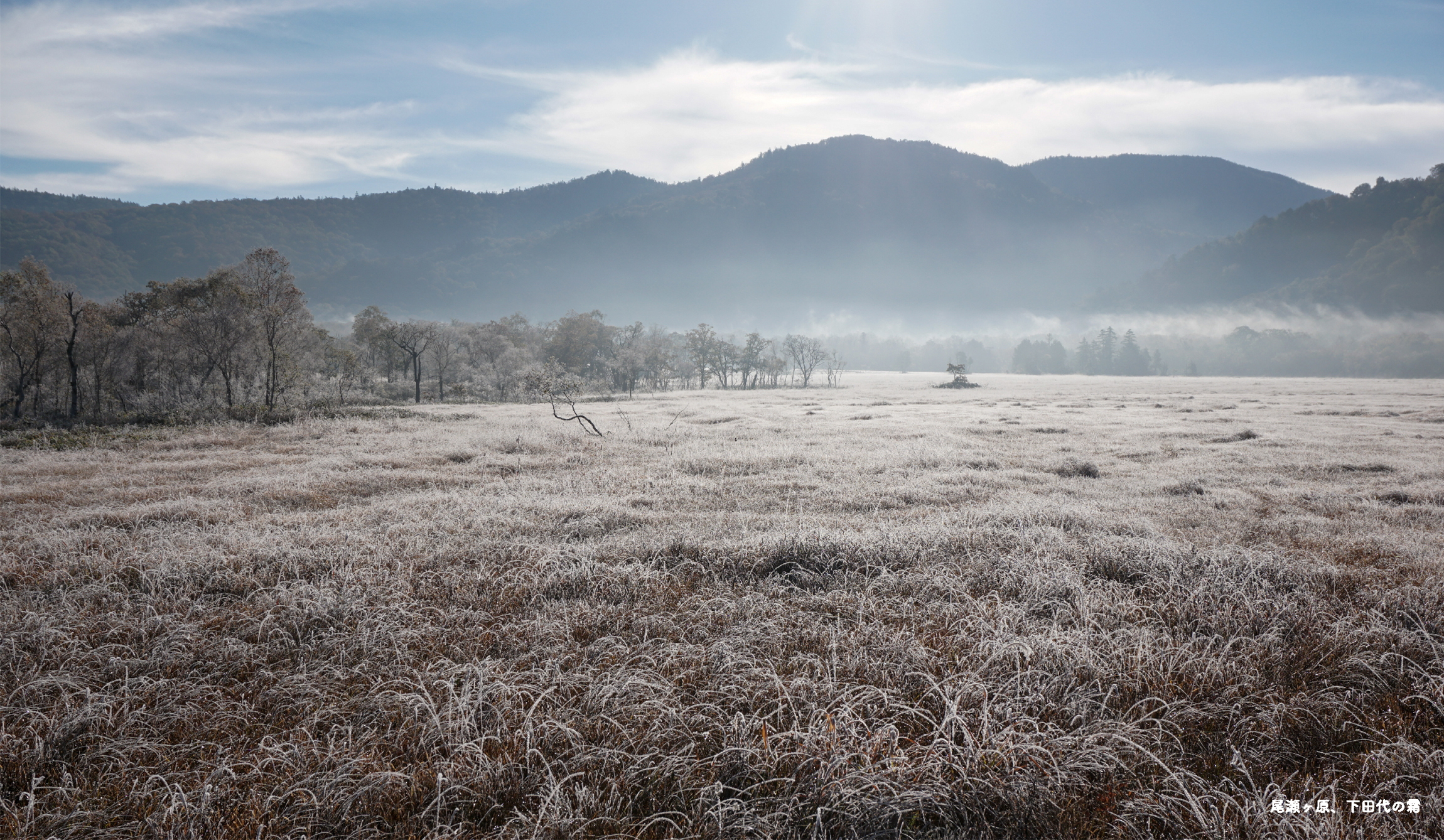 霜で輝く朝は空気がピンと張り詰めてとても気持ちが良いです。一面に霜が降りた朝は神々しい光景が広がります。気温が上がる8時くらいにはすぐ溶けてしまいます。短い間だけ見られる絶景です。霜が降りた木道は大変滑ります。転倒には十分ご注意ください。