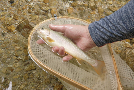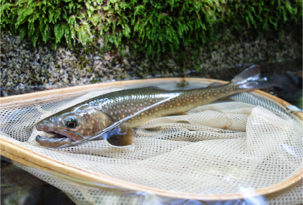 こちらの川に棲むイワナは、湯ノ岐川のイワナと較べて白味がかっているのが特徴です。
