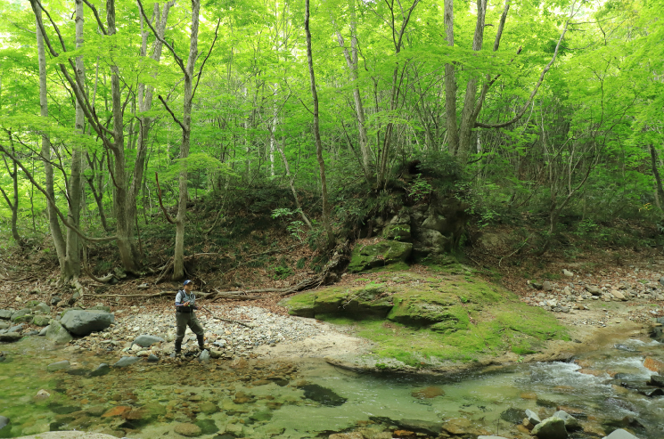 今回はフライフィッシングの達人にこの2つの川を案内していただき、新緑の森を流れる奇跡の景観と、美しい魚体をきらめかせる天然イワナを求めました。