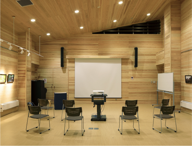 レクチャー室はプロジェクターや音響設備が充実。定期的なスライドショーイベントや学校団体向けのプログラムなどを実施しています。またレクチャー室は可動間仕切りにより、人数やイベントに合わせた部屋の大きさにすることが可能。プログラムが行われない時間帯は開放され、休憩室として使用しています。