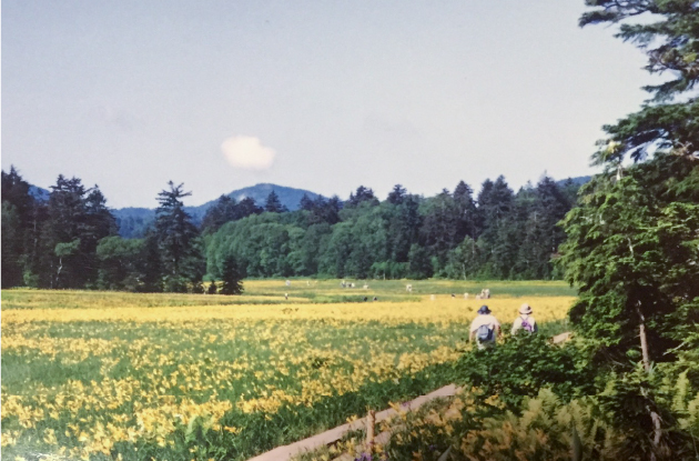 25年ほど前の大江湿原の様子。もともと尾瀬にはニホンジカは生息しておらず、食害とは無縁でした。大江湿原の端から端までニッコウキスゲが咲いていたことに驚きを感じます。