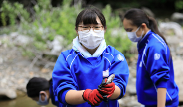 檜枝岐川の川原につくったつかみ取り用のプール(せき止めた水溜り)へ入ると、生徒たちは叫ばずにいられませんでした。それもそのはず檜枝岐川は雪解けから間もない初夏の尾瀬の水です。放たれたのは檜枝岐村で養殖しているイワナ。海辺の学校から来たとはいえ、生きている魚をつかむのは初めての生徒たちもいました。でもチームワークがいいんです。はじめは個々に魚を追っていた生徒たちでしたが、しばらくすると仲間と協力して追い込み、効率的につかみとれるようになるではありませんか。最後の1人もクラスメイトが追い囲んでくれて無事捕獲。クラス全員がイワナをつかみ取ることができました。感想を聞くと、