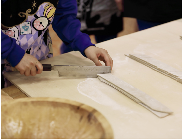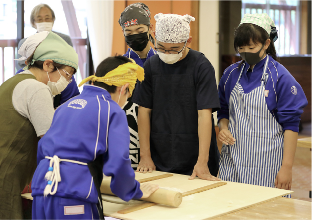 打ち棒で引き伸ばし、包丁でひし形に切りに。交代で作業を進めると、隅の方にいた生徒の1人が慣れた手つきで包丁を扱いはじめ、班の仲間からは驚きの声が。普段の授業ではわからない得意不得意があるものですね。