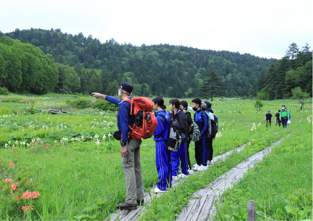 ガイドの長内覚さんは生徒たちの豊かな表情に囲まれて、「震災やコロナがあって子どもたちの表情が小さくなった気がしていますが、尾瀬の大自然に触れて、日常を忘れられるのかもしれません」と体験学習のやりがいを教えてくださいました。