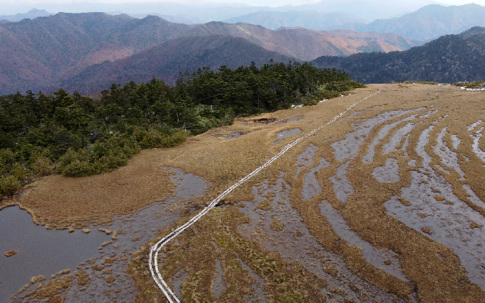 やがて平坦な山頂に薄い土壌ができて植物が生えるのですが、低温のため植物は枯れても分解が遅いため、少しずつ蓄積します。これが泥炭層です。泥炭はスポンジのように雨や雪の水を豊富に蓄えるようになり、山地湿原が誕生しました。