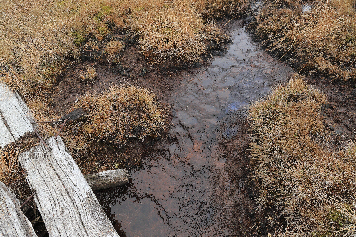 露出した泥炭層。蓄えられた水は少しずつ流出し、