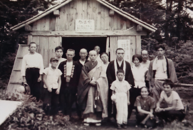 「この写真は大師堂の3回目の建て替え記念に撮影したものです。高野山の親王院から来た2人のお坊さんの真ん中に写るのが小学一年生の私です。昭和34年のことでした。びっくりしましたよ。こんな山の中に大師様の立派な坐像があるんですから」