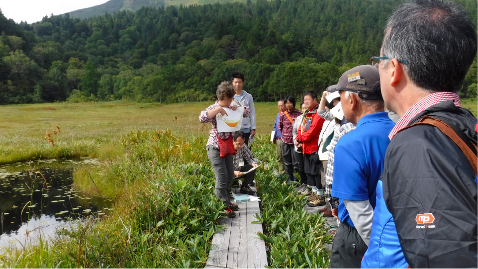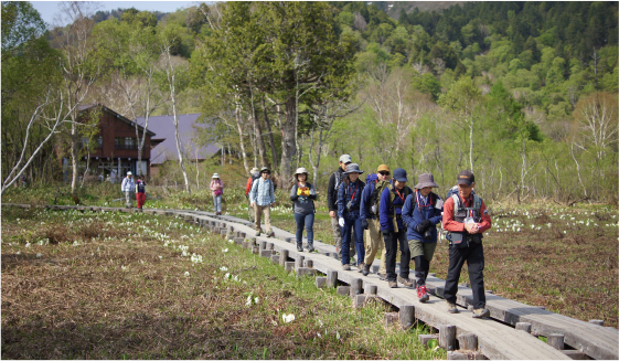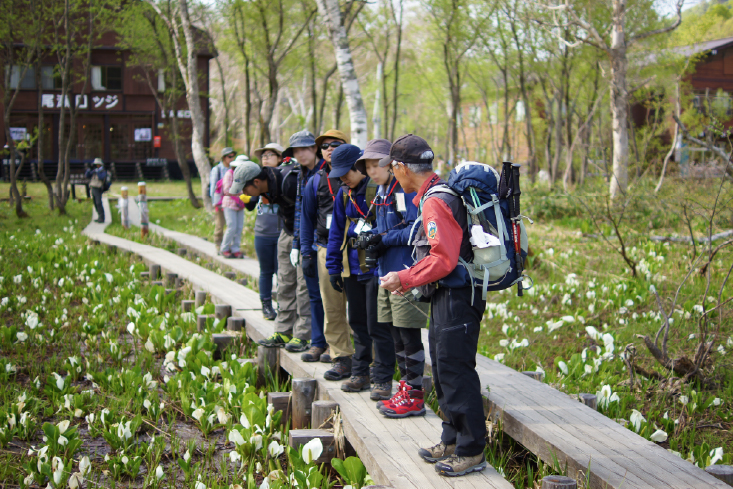 ボランティアとして一定の経験を積まれた方は、利用者のみなさんに尾瀬の自然をもっとよく知ってもらうための解説活動も行っています。これがインタープリター的な活動です。