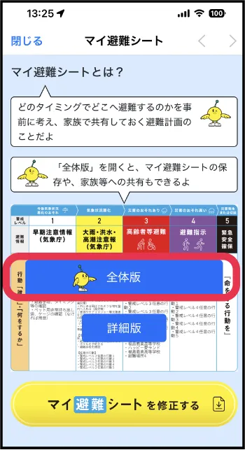 - ❷「全体版」をタップしてマイ避難シートを表示