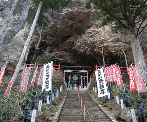 弘法大師開闢の霊験あらたかな不動尊 山本不動尊は、大同2年(807年・平安時代)弘法大師が東北行脚でこの地に訪れたとき、住民を苦しめていた悪鬼を払いのけるために護摩壇を築いて祈祷したことが起源といわれています。不動明王を本尊とし、130段もの石段を登りきると現れる奥の院に、その尊像が納められています。また、奥の院後方の岩肌には不動明王の尊顔が浮かび上がっている箇所があり、霊験あらたかな雰囲気をさらに高めています。参道には樹齢100年を超える大きな杉の木が立ち並び、秋には美しい紅葉がライトアップされるなど、雄大な自然に囲まれた山本不動尊には、元朝大護摩祈祷や節分会豆まき式などをはじめ、年間を通して大勢の参拝客が訪れています。