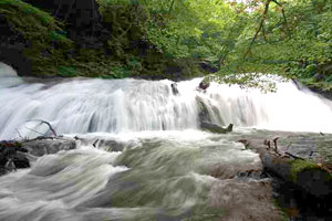 聖ヶ岩の傍を流れる隈戸川の下流、「聖ヶ岩ふるさとの森」内にあるこの滝は、落差は5m~3mと低めですが、滝の幅が50m程あり、夏は水流の勢いに圧倒されます。滝の正面には護岸も兼ねた観瀑台が作られています。遊歩道があり、渓谷沿いを歩いて5分ほどで滝に到着します。
