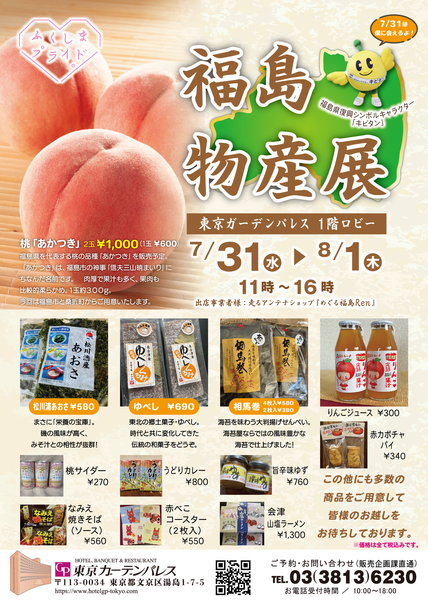 旬を迎えた福島の桃や、地元定番のお菓子「ままどおる」、全国新酒鑑評会金賞受賞の日本酒など、