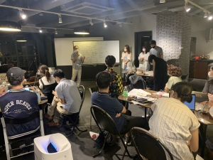 ↑日本橋馬喰横山町にある+PLUSLOBBY日本橋問屋街で開催した「大人の部室 福島県会」