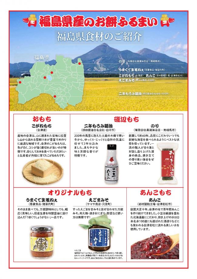 ・福島県産のもち米を使用した餅に、あんこ、えごまみそ、醤油&海苔、うまくて生姜ねぇをトッピングしてふるまう。