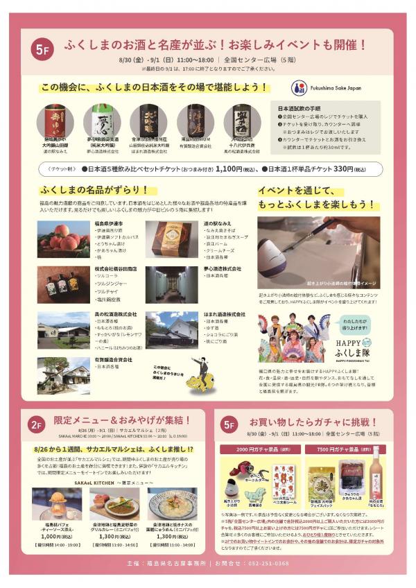 福島県産品に対する風評払拭と魅力発信を目的に安全性や美味しさを広く周知するため、県内市町村等の協力を得て、名古屋市最大の繁華街である栄にグルメやショッピングなど充実した機能を有する中日ビル内を複合的に利用しながら、県産品の販売、県産の食材を使用した料理の提供及び福島の酒飲み比べを行い、実際に県産品の美味しさを届けます。